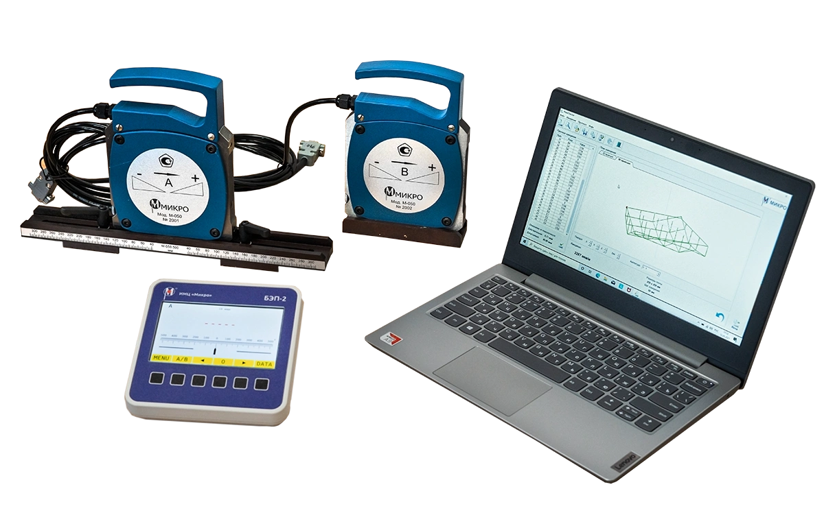 Комплект включает в себя два уровня, электронный блок, каретку измерительную, нетбук, программу Plate Checker для расчета отклонения от плоскостности плит и прямолинейности линеек.